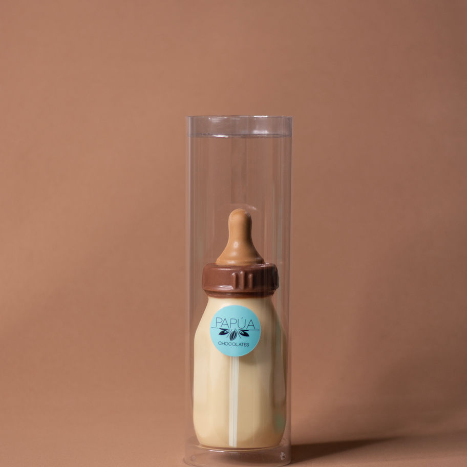 Un regalo estupendo para las nuevas mamás o papás, un bibe hecho 100% artesanalmente con el mejor chocolate, compuesto en su mayor parte con chocolate blanco Ivoire y la tetina de chocolate Dulcey.