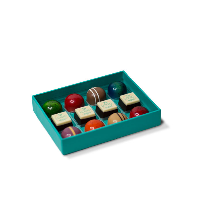 Caja de 12 bombones artesanales variados con 4 de ellos personalizados, en caja de tapa dura con relieve, alveolos y almohadillas para proteger tus bombones.